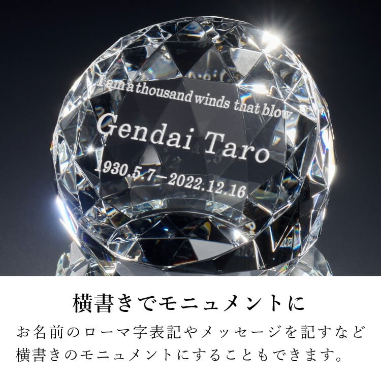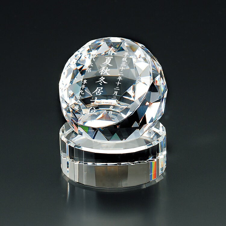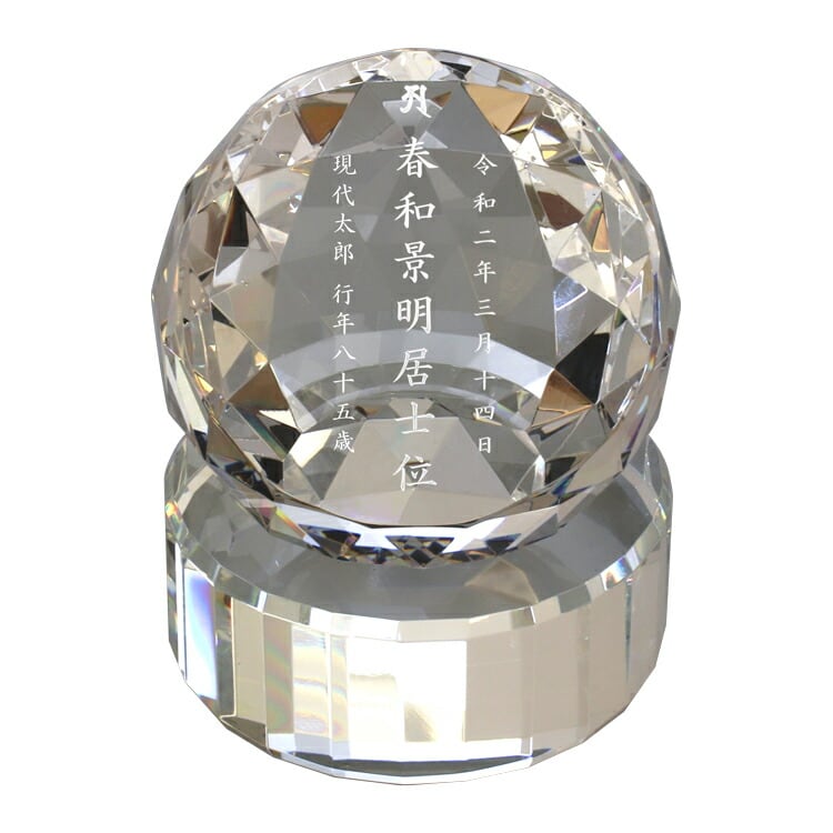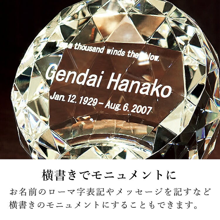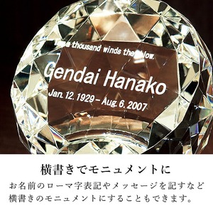 おしゃれなガラス位牌です。光の反射と屈折の美しさを最大限に引き出したモダンデザイン。戒名のない無宗教の手元供養にもおすすめです。文字入れ代別途。