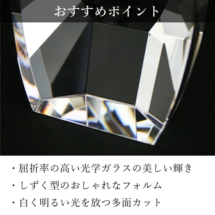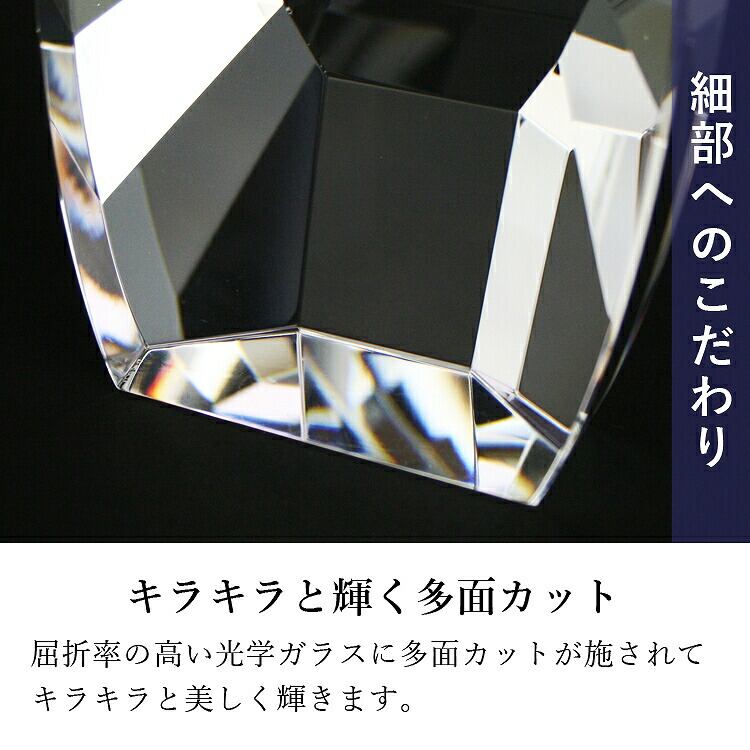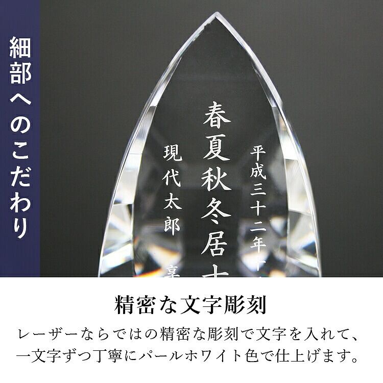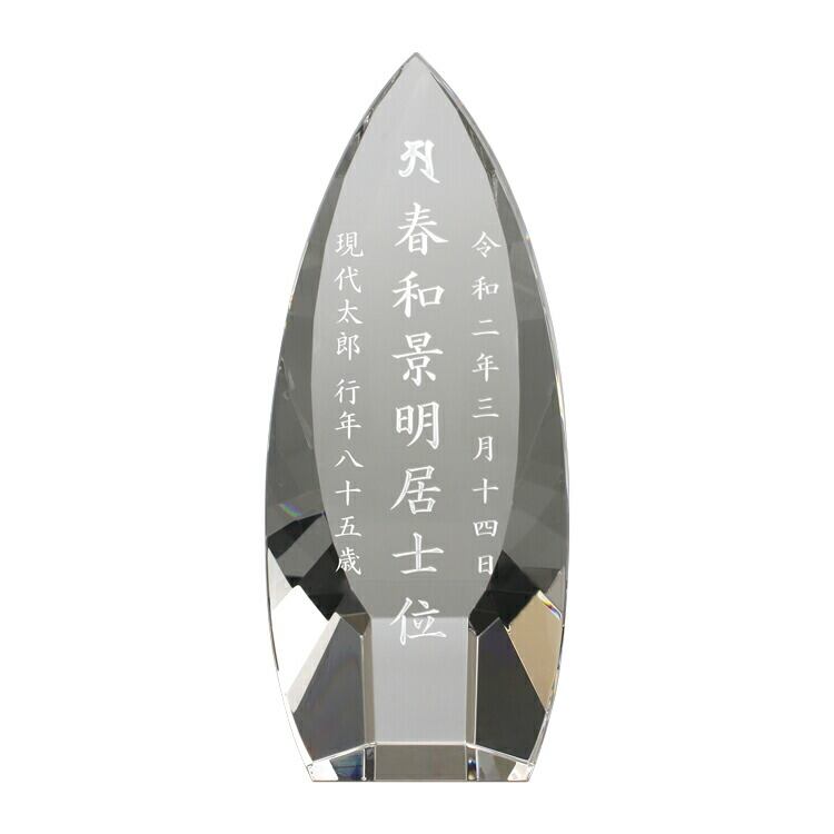 おしゃれなガラス位牌です。光の反射と屈折の美しさを最大限に引き出したモダンデザイン。戒名のない無宗教の手元供養にもおすすめです。文字入れ代別途。