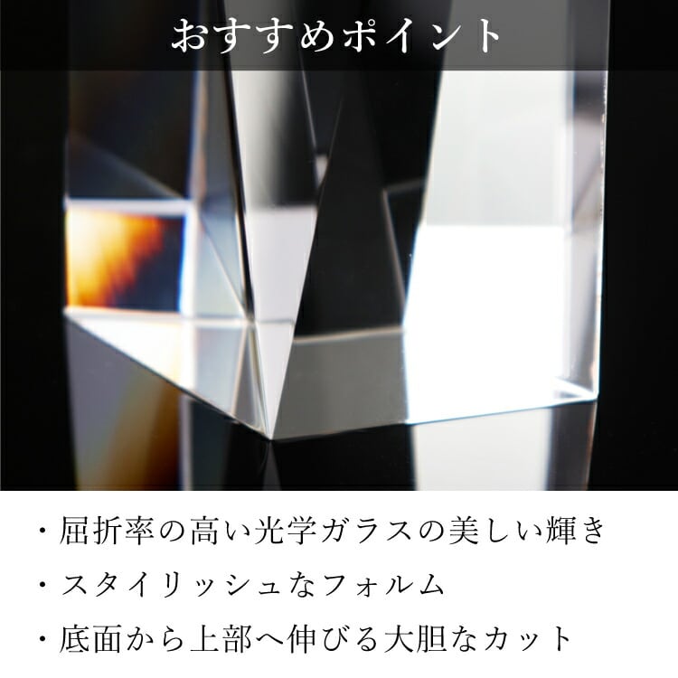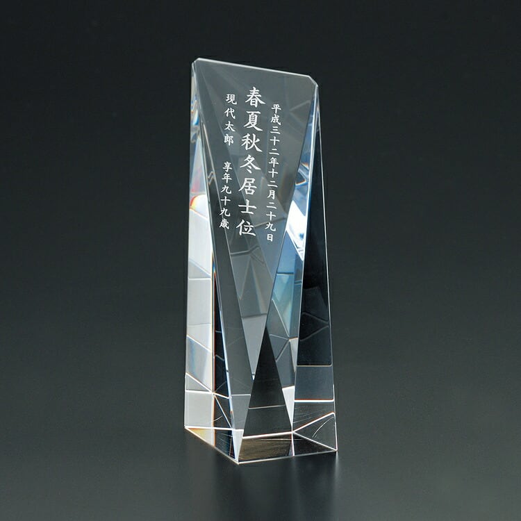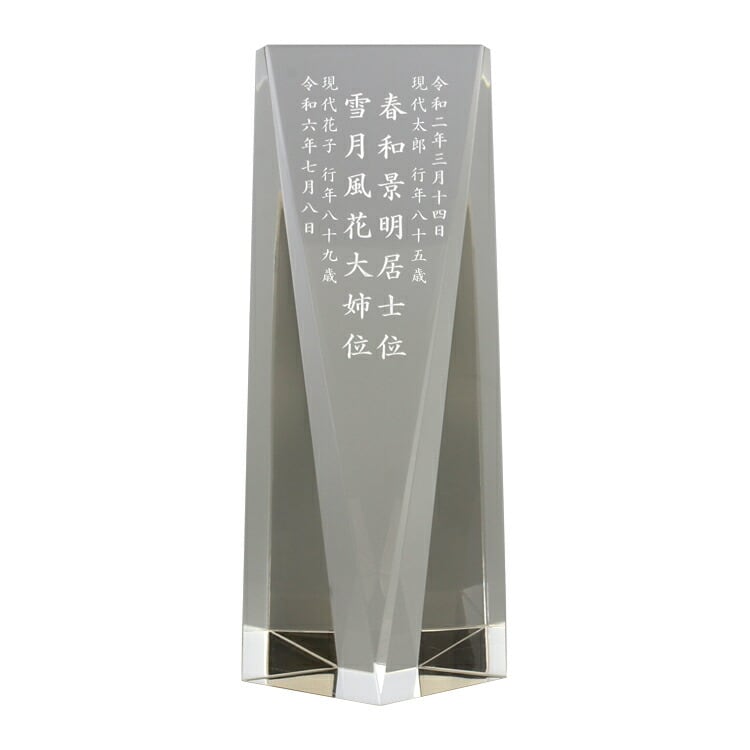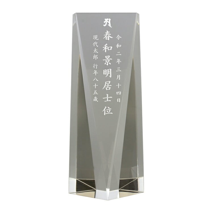 おしゃれなガラス位牌です。光の反射と屈折の美しさを最大限に引き出したモダンデザイン。戒名のない無宗教の手元供養にもおすすめです。文字入れ代別途。