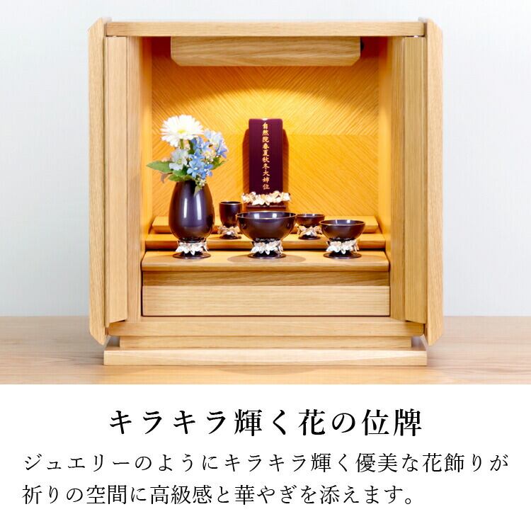 華やかなモダン位牌。かわいい花飾りが輝くおしゃれなデザインです。夫婦位牌の名入れができるので小さい仏壇やコンパクトな手元供養にも最適。文字入れ代別途。