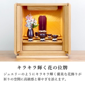 華やかなモダン位牌。かわいい花飾りが輝くおしゃれなデザインです。夫婦位牌の名入れができるので小さい仏壇やコンパクトな手元供養にも最適。文字入れ代別途。