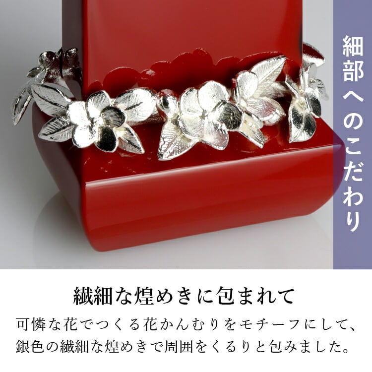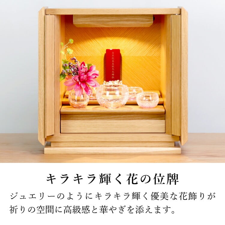 華やかなモダン位牌。かわいい花飾りが輝くおしゃれなデザインです。夫婦位牌の名入れができるので小さい仏壇やコンパクトな手元供養にも最適。文字入れ代別途。