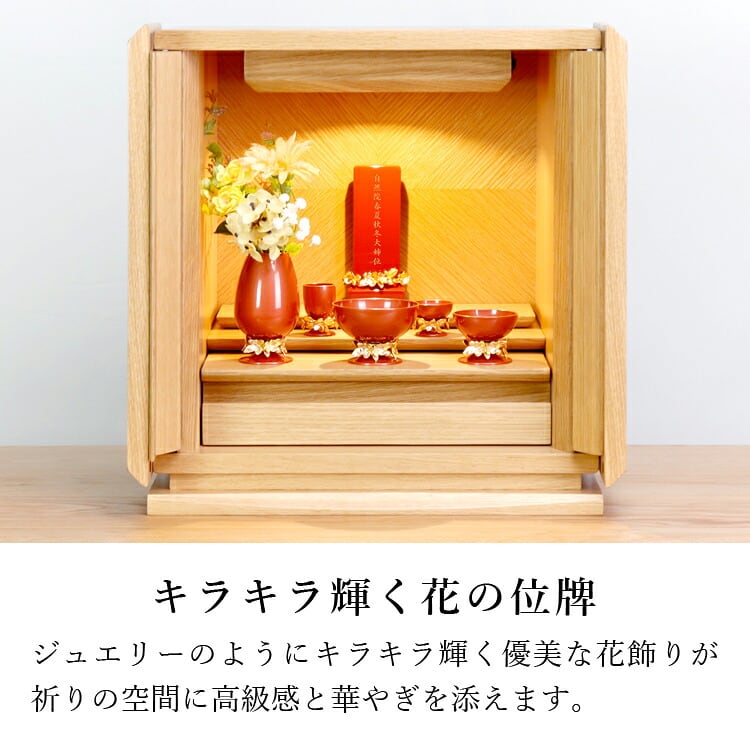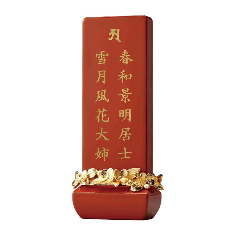 華やかなモダン位牌。かわいい花飾りが輝くおしゃれなデザインです。夫婦位牌の名入れができるので小さい仏壇やコンパクトな手元供養にも最適。文字入れ代別途。