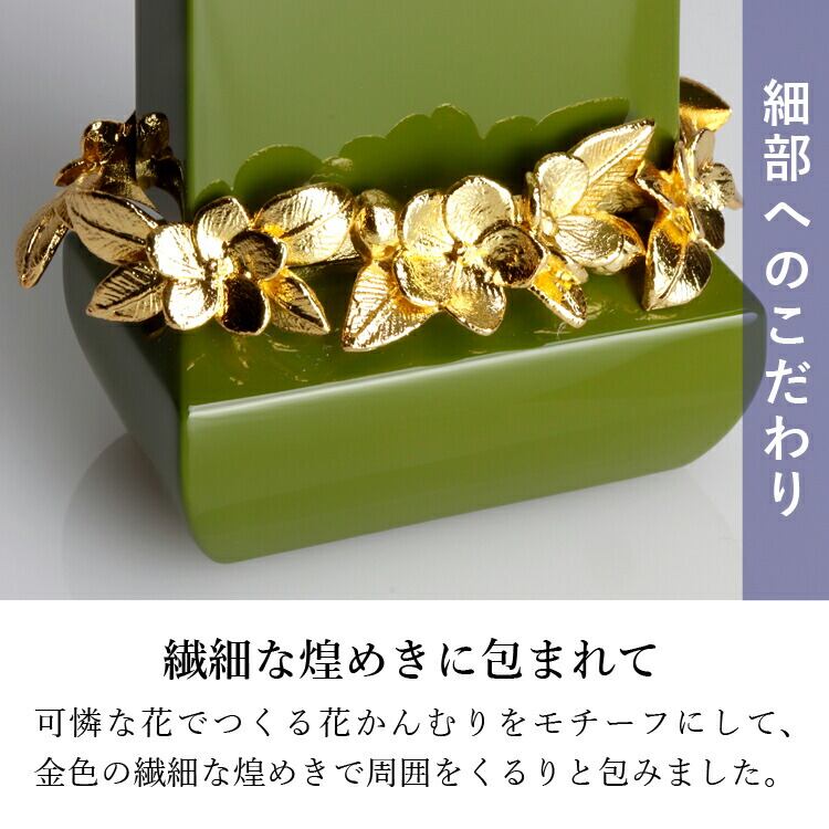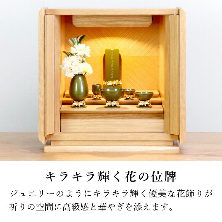 華やかなモダン位牌。かわいい花飾りが輝くおしゃれなデザインです。夫婦位牌の名入れができるので小さい仏壇やコンパクトな手元供養にも最適。文字入れ代別途。