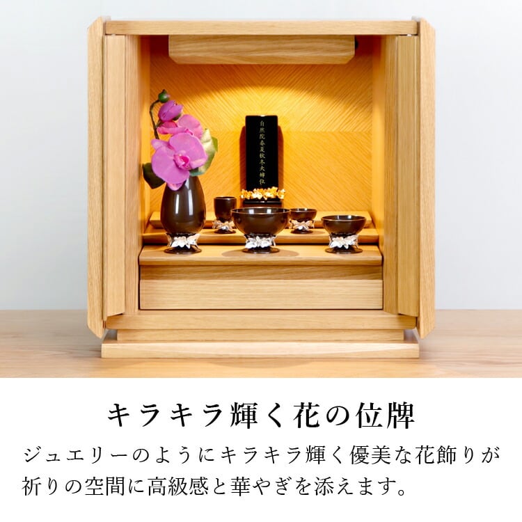 華やかなモダン位牌。かわいい花飾りが輝くおしゃれなデザインです。夫婦位牌の名入れができるので小さい仏壇やコンパクトな手元供養にも最適。文字入れ代別途。