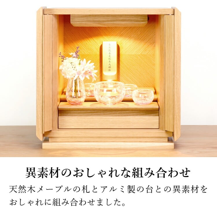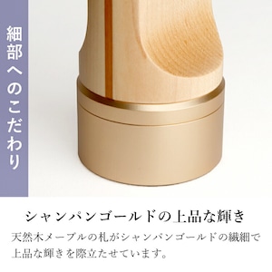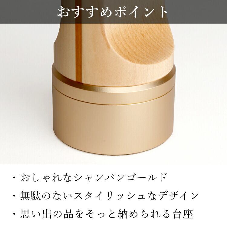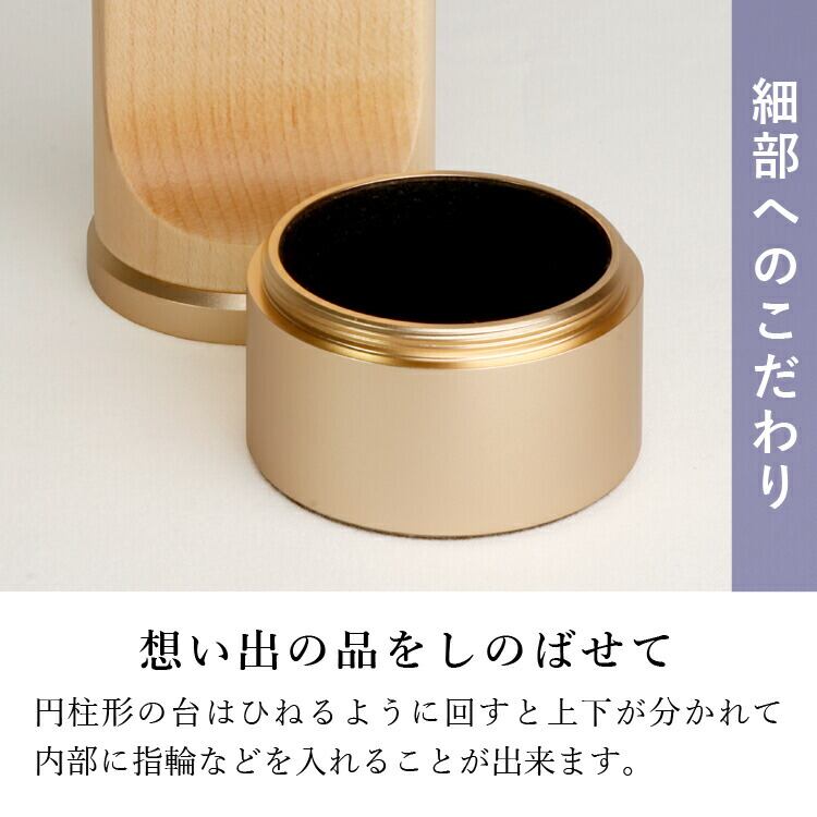 おしゃれでモダン位牌です。シャンパンゴールドの台座内部に小さな品を納められます。夫婦位牌の名入れもできるのでミニ仏壇やコンパクトな手元供養にも最適です。