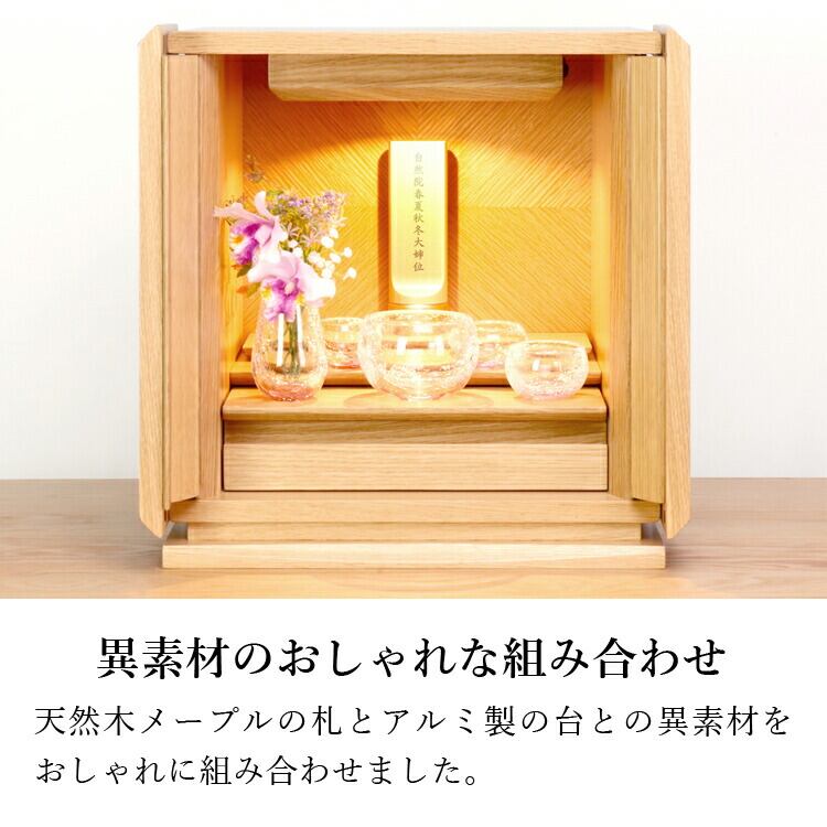おしゃれでモダン位牌です。シャンパンゴールドの台座内部に小さな品を納められます。夫婦位牌の名入れもできるのでミニ仏壇やコンパクトな手元供養にも最適です。