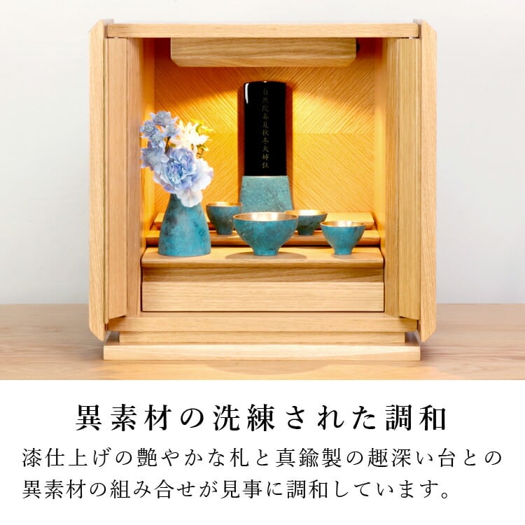 高岡の真鍮鋳物を用いたモダン位牌です。おしゃれな台座は自然に風合いが増してきます。夫婦位牌の名入れもできるので小さい仏壇やコンパクトな手元供養にも最適。