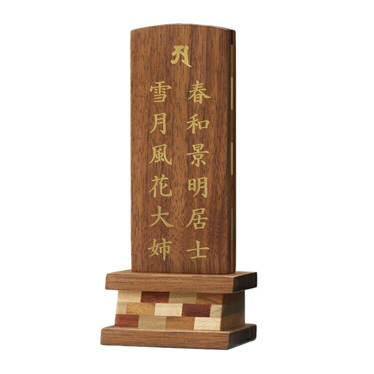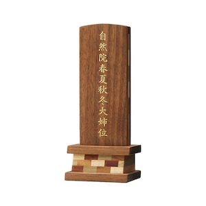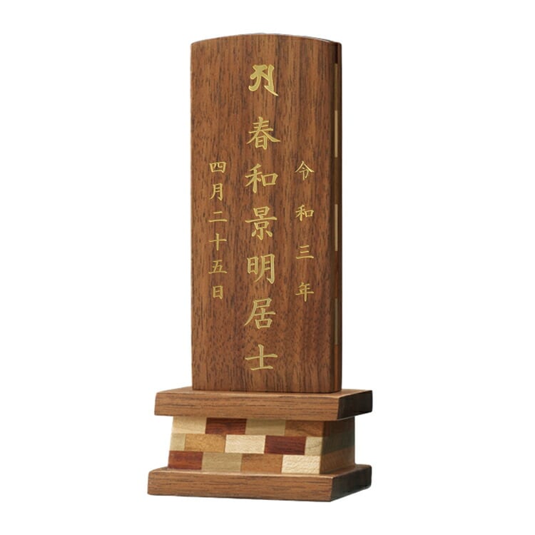 おしゃれな寄せ木のモダン位牌です。自然の色合いを活かしてデザインしました。コンパクトで夫婦位牌の名入れもできるので小さい仏壇や手元供養にもおすすめです。