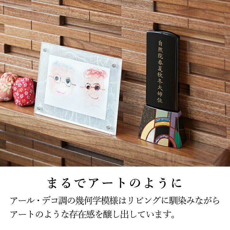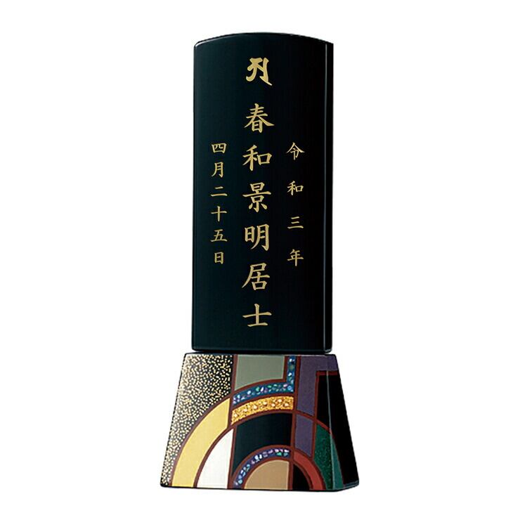 輪島塗のおしゃれなモダン位牌です。鮮やかな色彩と大胆なデザインの蒔絵は唯一無二の華やかな高級感を演出します。特別感のある手元供養にもおすすめです。