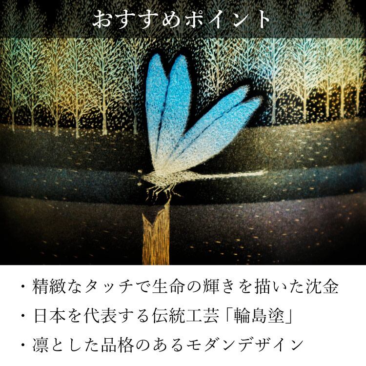 輪島塗のおしゃれなモダン位牌です。大自然の中で生命がかがやく一瞬を沈金で描いた高級感あふれるデザインです。特別感のある手元供養にもおすすめです。