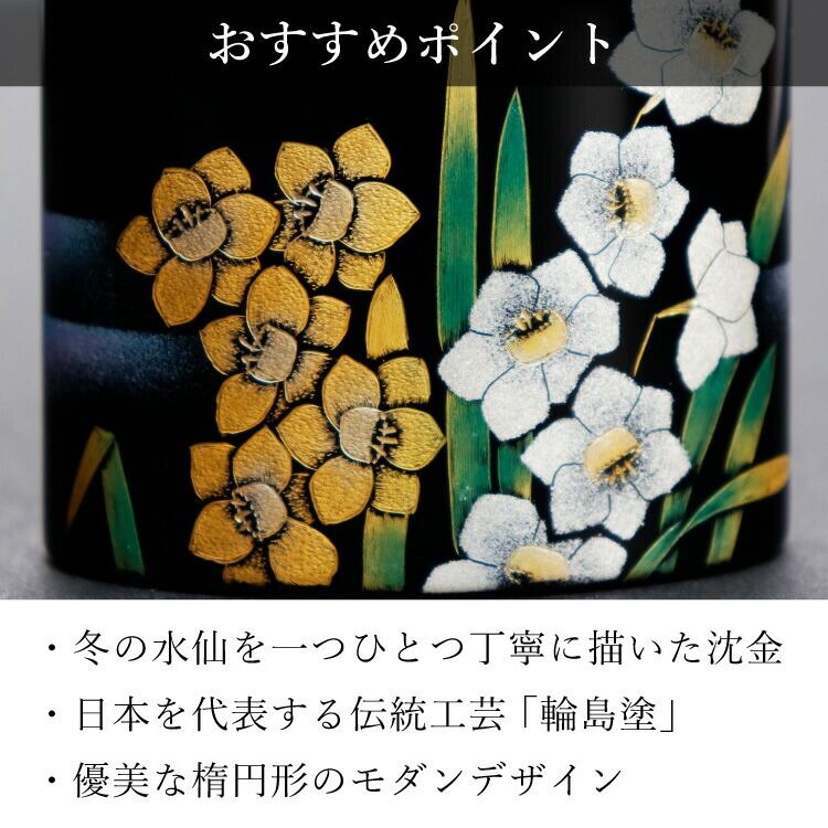 輪島塗のおしゃれなモダン位牌です。かわいい水仙の花に職人の技術力が感じられ、高級感のある佇まい。夫婦位牌の名入れができるので小さい手元供養にも最適です。