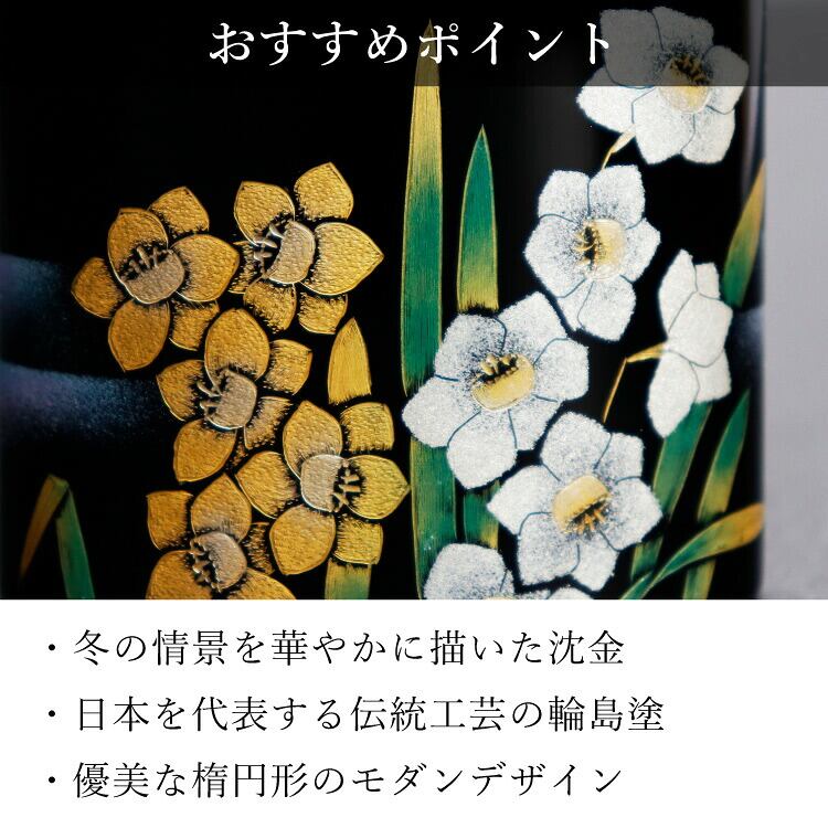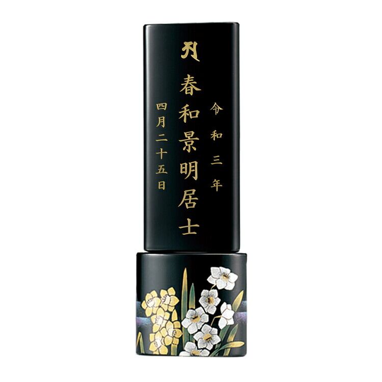 輪島塗のおしゃれなモダン位牌です。かわいい水仙の花に職人の技術力が感じられ、高級感のある佇まい。夫婦位牌の名入れができるので小さい手元供養にも最適です。