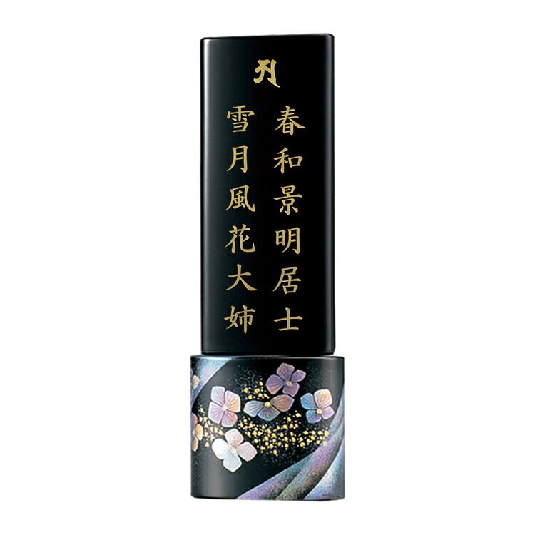 輪島塗のおしゃれなモダン位牌です。かわいいアジサイの花に職人の技術力が感じられ、高級感のある佇まい。夫婦位牌の名入れができるので小さい手元供養にも最適。