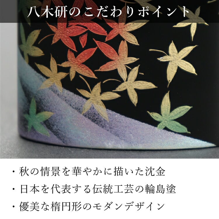 輪島塗のおしゃれなモダン位牌です。かわいい紅葉の風景に職人の技術力が感じられ、高級感のある佇まい。夫婦位牌の名入れができるので小さい手元供養にも最適。