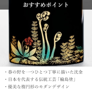 輪島塗のおしゃれなモダン位牌です。かわいい春のわらびに職人の技術力が感じられ、高級感のある佇まい。夫婦位牌の名入れができるので小さい手元供養にも最適。