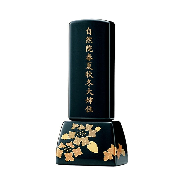 越前塗のモダン位牌。職人が手描きしたかわいいアジサイの蒔絵がおしゃれです。夫婦位牌の名入れができるのでコンパクトな手元供養にも最適。文字入れ代別途。