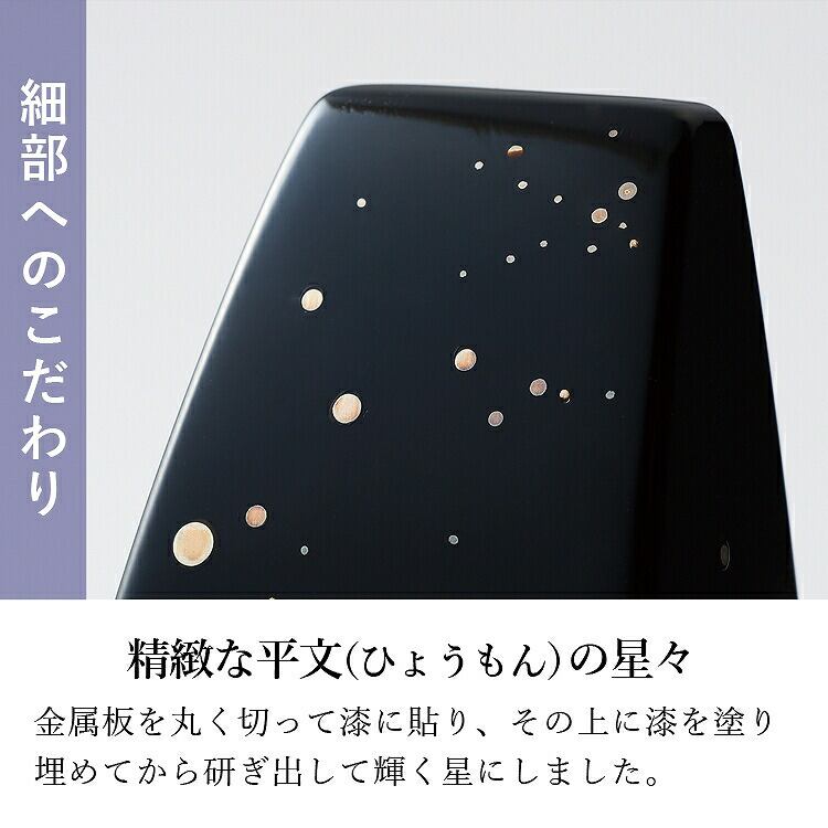 輪島塗のおしゃれなモダン位牌です。蒔絵師の木谷陽子氏が静かな夜も見守ってくれる満点の星を描きました。お一人様の名入れ書き文字代込み。