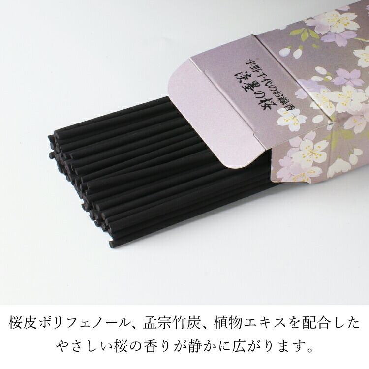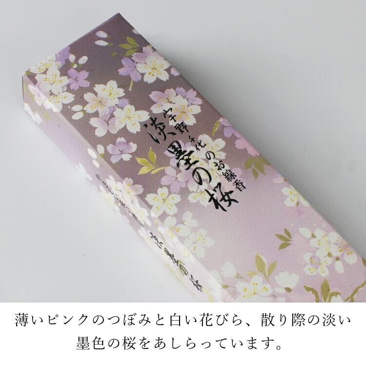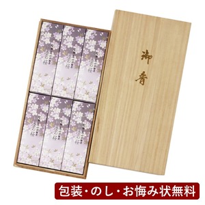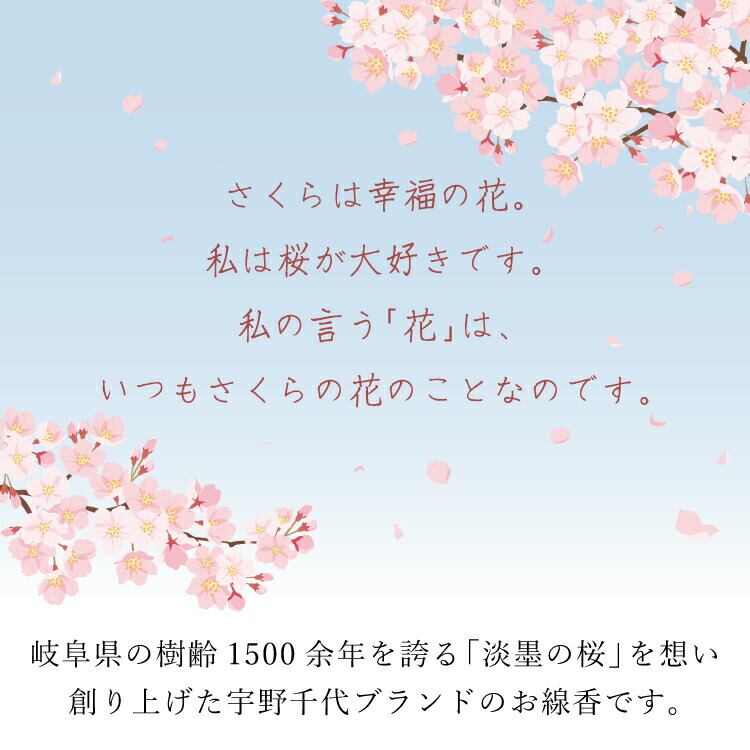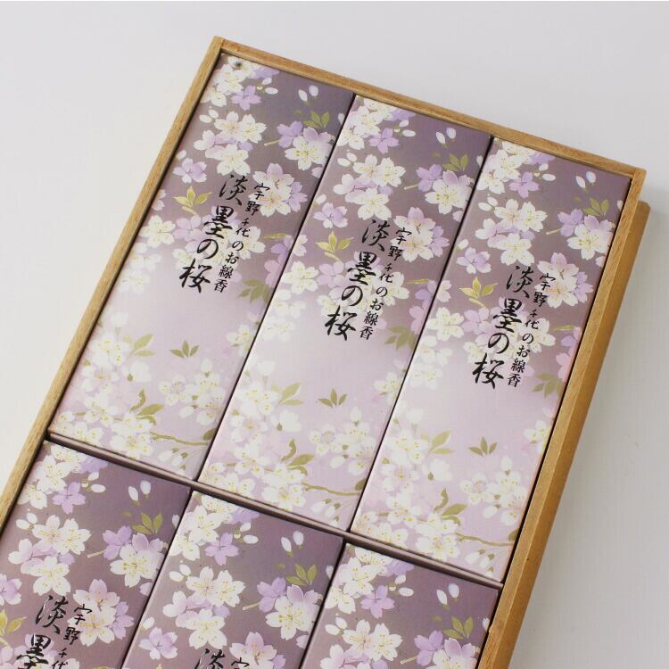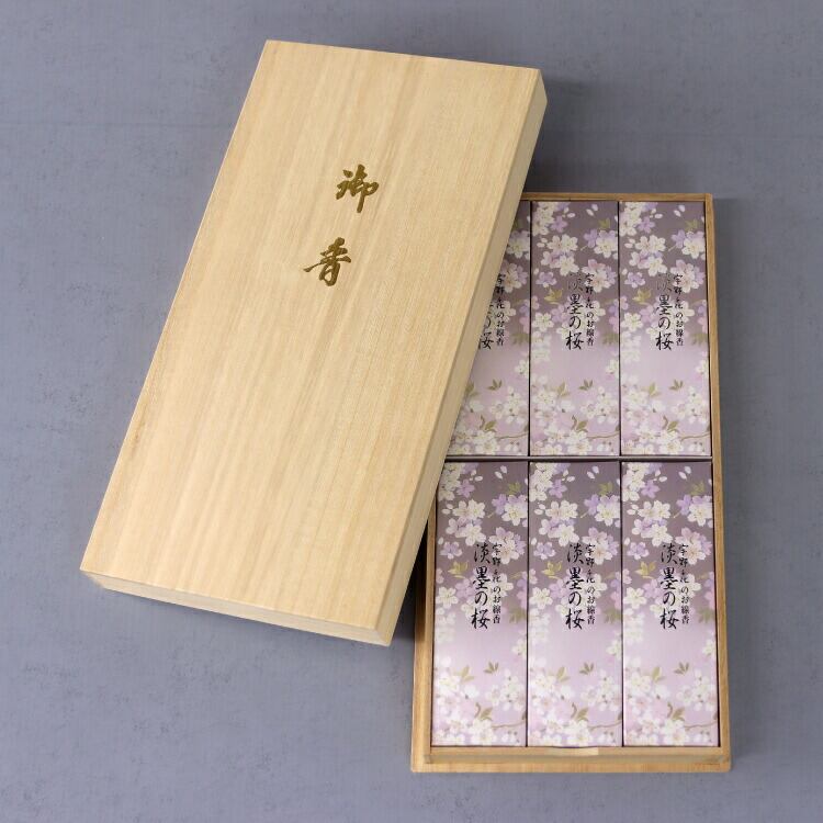 煙の少ないお線香です。宇野千代の愛した樹齢1500余年を誇る淡墨桜(うすずみざくら)をイメージした風雅でたおやかな香りです。6箱入。