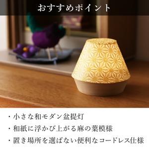 コードレスのミニ盆提灯。明かりに浮かび上がる麻の葉模様が和モダン。コンパクト仏壇や卓上に置ける小さいサイズです。お盆以外にも、かわいいインテリアとしてご使用頂けます。