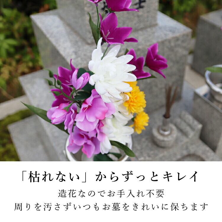 仏壇やお墓にお供えする造花です。一対(2本組)の華やかなお供え花なので、お盆やお彼岸のお墓参りでは枯れない墓花として生花のような美しさを長く保ちます。