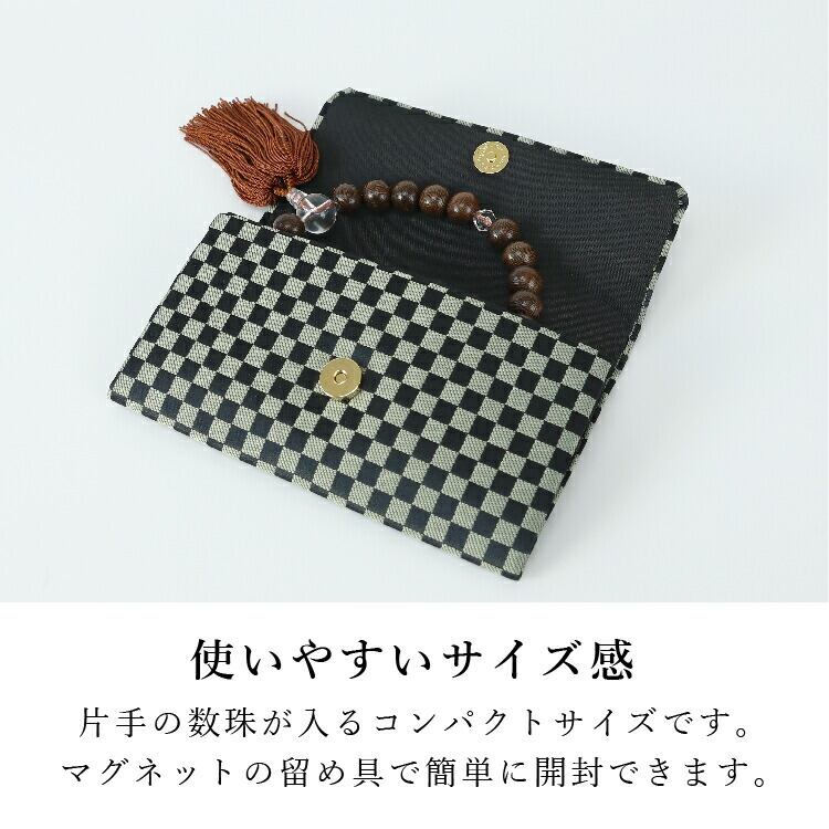 全ての宗派でお使いいただけるマチ付きの数珠袋。数珠・念珠を入れて保管したり携帯したりするケースです。マグネットの留め具なので出し入れが簡単です。