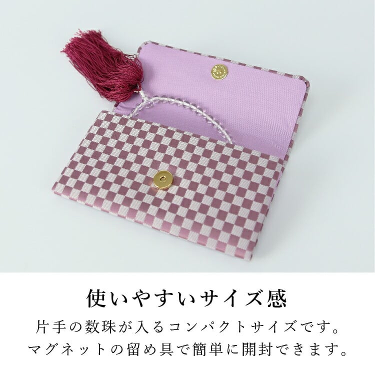 全ての宗派でお使いいただけるマチ付きの数珠袋。数珠・念珠を入れて保管したり携帯したりするケースです。マグネットの留め具なので出し入れが簡単です。