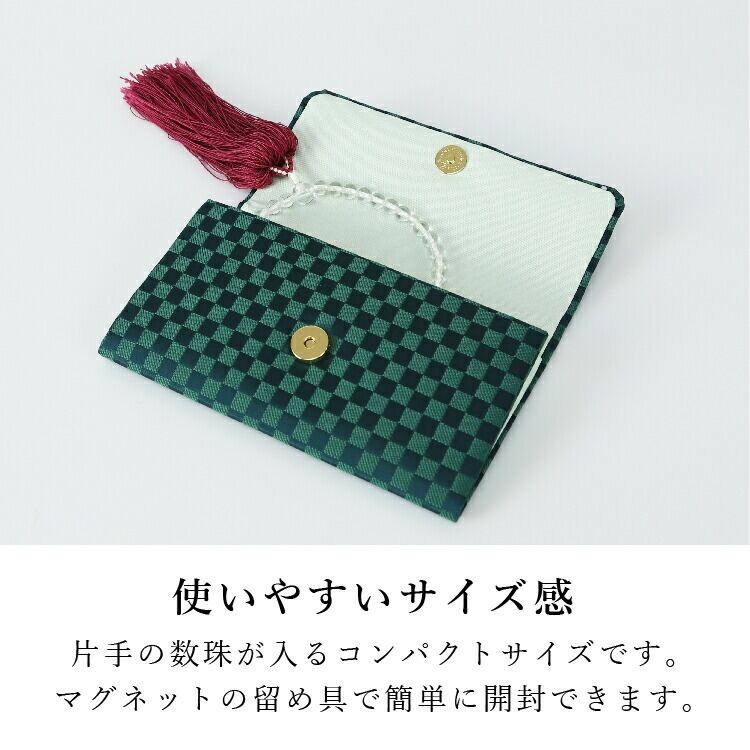 全ての宗派でお使いいただけるマチ付きの数珠袋。数珠・念珠を入れて保管したり携帯したりするケースです。マグネットの留め具なので出し入れが簡単です。