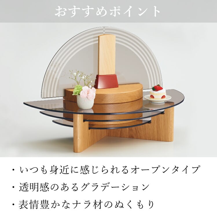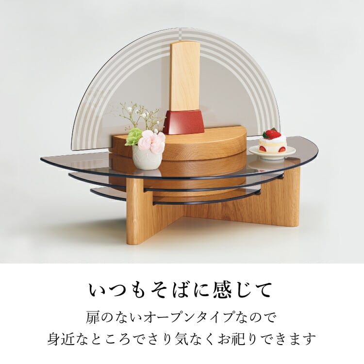 おしゃれなモダン仏壇です。小さいオープンタイプなのでリビングやマンションに置けて、ガラスの輝きが上質なインテリア空間を演出します。手元供養にもおすすめ。