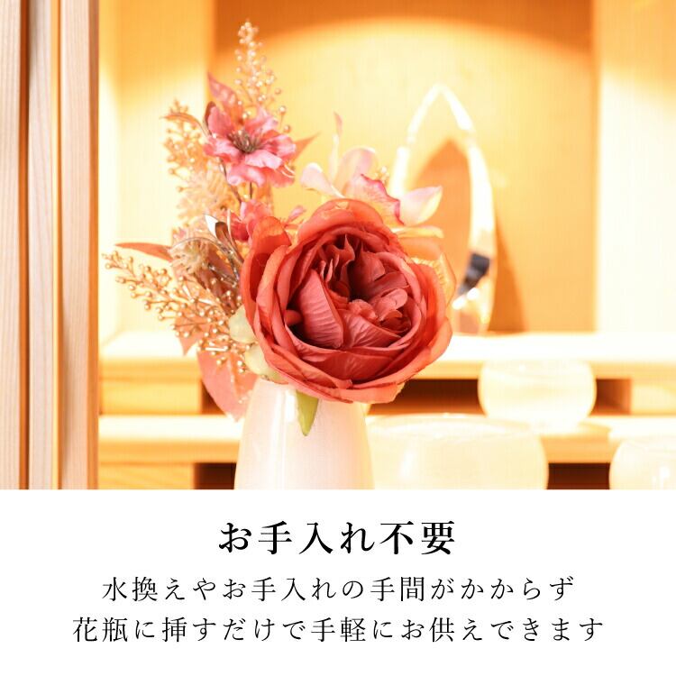 枯れない仏花です。おしゃれな造花なのでインテリアに馴染み、そのまま仏壇にお供えできて手間がかかりません。お盆や法事の贈り物としてもご利用いただけます。
