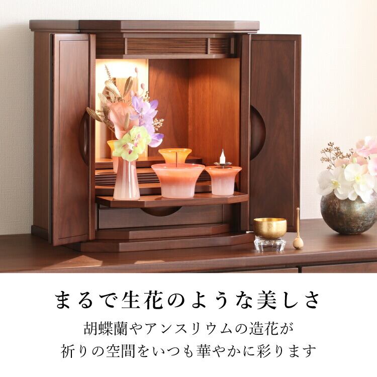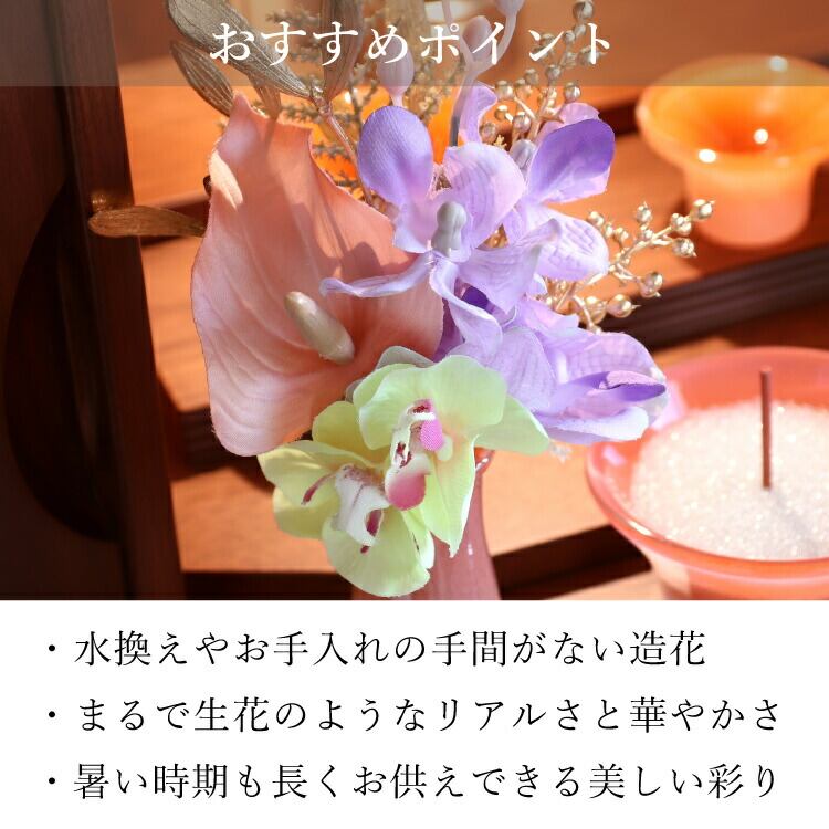 枯れない仏花です。おしゃれな造花なのでインテリアに馴染み、そのまま仏壇にお供えできて手間がかかりません。お盆や法事の贈り物としてもご利用いただけます。