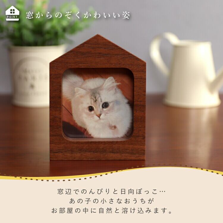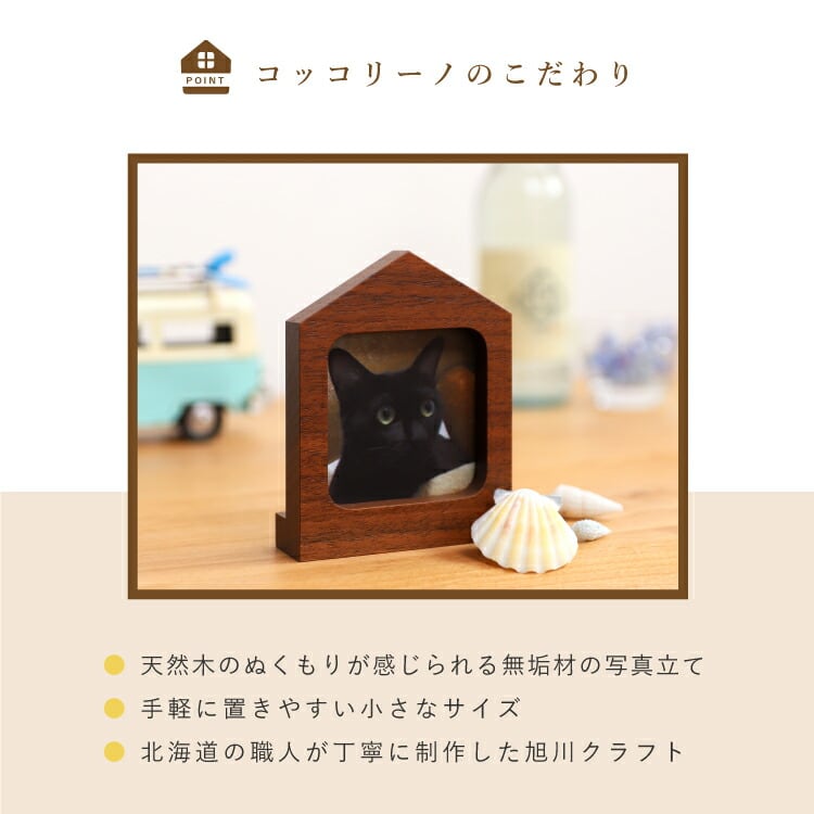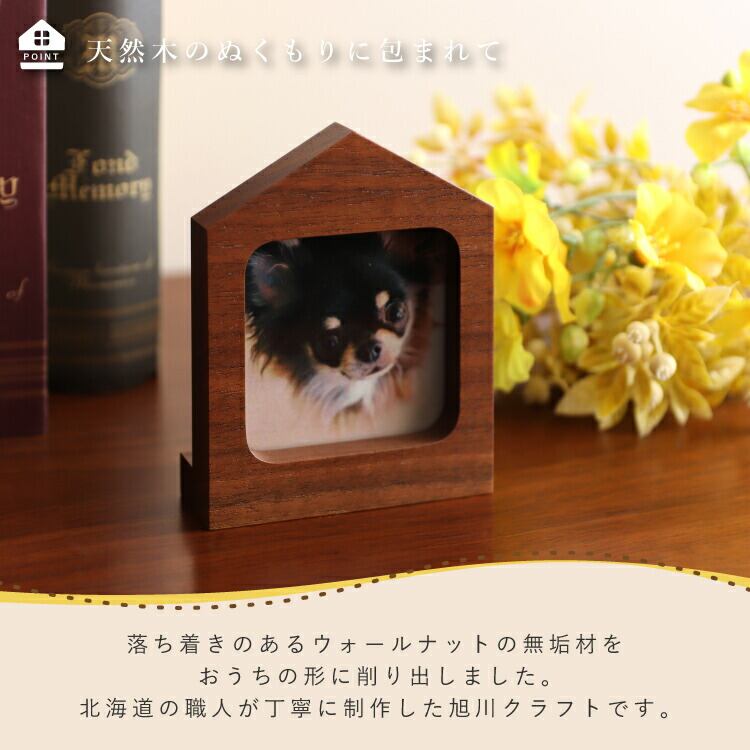 かわいい写真立てです。旭川の職人による安心の日本製。小さいのでペット供養の仏壇やメモリアルグッズのそばに飾りやすく、思い出が心にやさしくよみがえります。